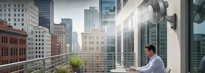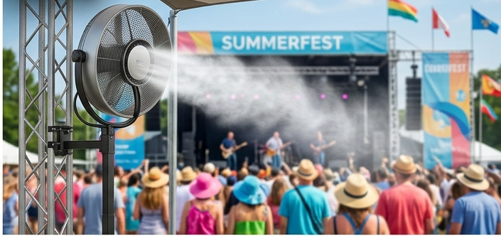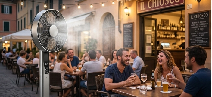 Ventilatori nebulizzatori per dehor, terrazze, ristoranti, bar ed eventi all'aperto. Raffrescamento immediato, senza installazioni complesse.